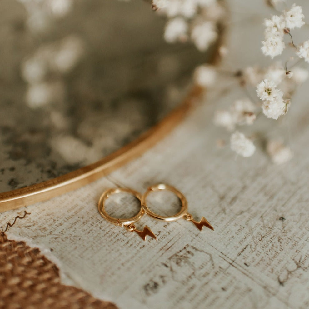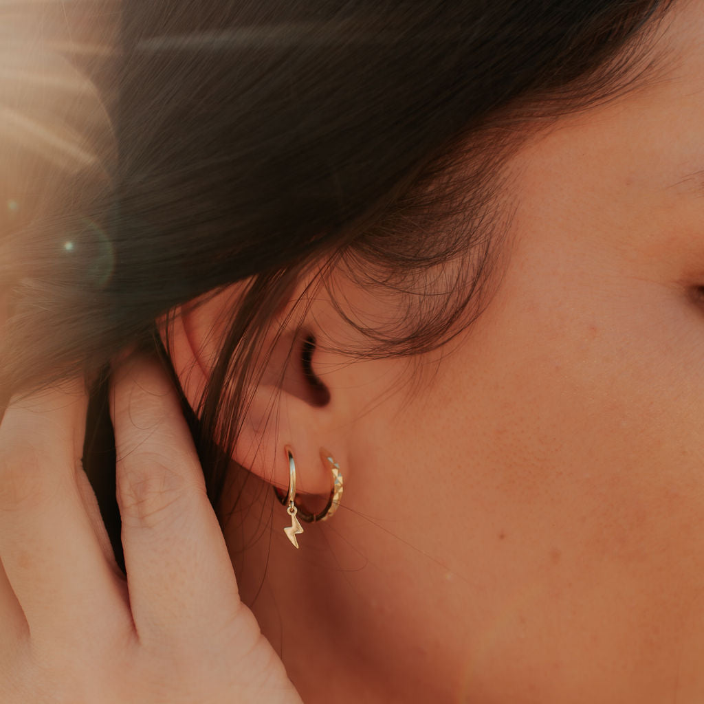The Lightning Hoops are the perfect accessory for any outfit. Available in high quality gold vermeil, these huggies are hypoallergenic, good for sensitive skin, and wear and tarnish resistant. Outer diameter is 12mm.